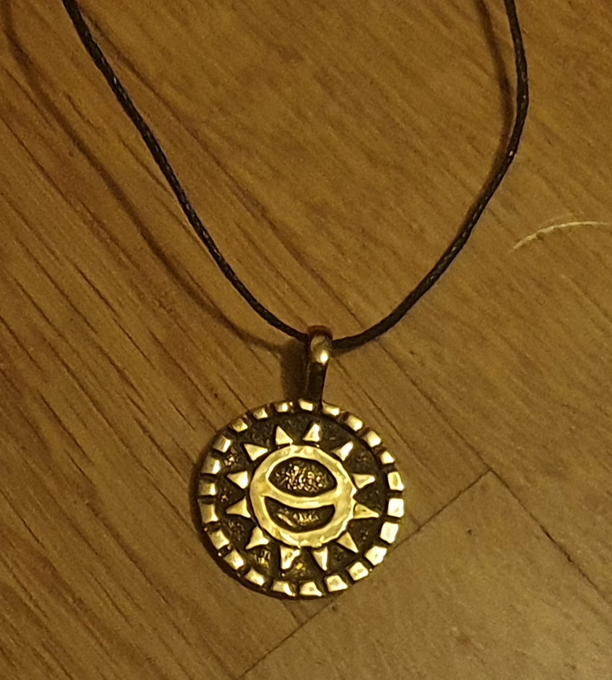 Collier « soleil inca » type bronze vieilli avec cordon noir adaptable.
